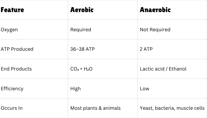 | End Products | CO₂ + H₂O | Lactic Acid / Ethanol |