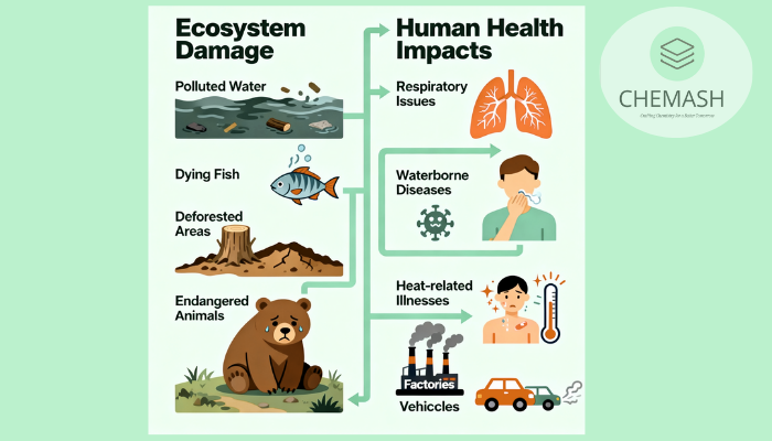 script type=”application/ld+json”> { “@context”:”https://schema.org”, “@type”:”Article”, “headline”:”Effects on Ecosystems and Human Health”, “description”:”How pollution and waste impact biodiversity, ecosystems, and human well-being. Includes causes, effects, quiz and FAQs.”, “image”:”https://chemash.in/assets/images/ecosystems-health-hero.jpg”, “author”:{“@type”:”Organization”,”name”:”CHEMASH”}, “publisher”:{“@type”:”Organization”,”name”:”CHEMASH”,”logo”:{“@type”:”ImageObject”,”url”:”https://chemash.in/assets/images/logo.png”}}, “mainEntityOfPage”:{“@type”:”WebPage”,”@id”:”https://chemash.in/effects-ecosystems-human-health”} }