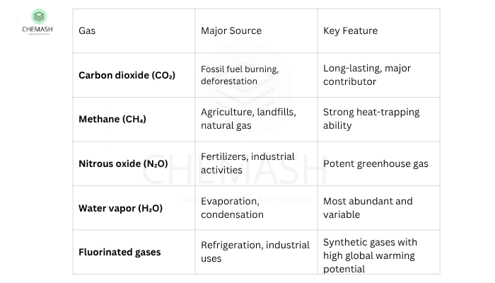 | Carbon dioxide (CO₂) | Burning fossil fuels, deforestation | Main contributor to warming |